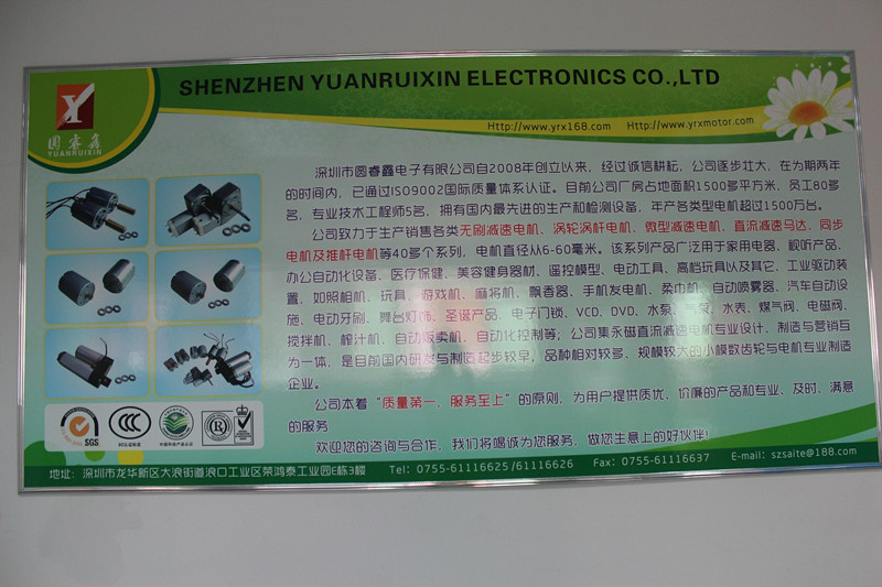 深圳市圓睿鑫電子有限公司自2008年創(chuàng)立以來(lái),經(jīng)過(guò)誠(chéng)信耕耘,在為期兩年的時(shí)間內(nèi),已通過(guò)ISO9001:2000國(guó)際質(zhì)量體系認(rèn)證。公司廠(chǎng)房占地面積2000多平方米,員工100人,專(zhuān)業(yè)技術(shù)工程師6名,擁有國(guó)內(nèi)最先進(jìn)的生產(chǎn)和檢測(cè)設(shè)備,年產(chǎn)各類(lèi)減速電機(jī)超過(guò)2~300萬(wàn)臺(tái)。因公司發(fā)展需要,于2020年底,將生產(chǎn)基地遷往擁有最美小鎮(zhèn)之稱(chēng)的東莞市清溪鎮(zhèn),依山傍水,依托美麗的大自然環(huán)境和地方文化,全新的東莞市圓睿鑫電子有限公司將借助深圳母公司平臺(tái),一步步走上新的臺(tái)階。 東莞公司將繼續(xù)致力于生產(chǎn)銷(xiāo)售各類(lèi)無(wú)刷減速電機(jī) 渦輪渦桿電機(jī),微型減速電機(jī),直流減速馬達(dá),交流手搖發(fā)電機(jī)、同步電機(jī)及空心杯電機(jī)等,電機(jī)直徑從6-60毫米為定位,系列產(chǎn)品廣泛用于智能家電、智能辦公自動(dòng)化設(shè)備、智能醫(yī)療、美容健身器材、遙控模型、電動(dòng)工具、高檔玩具以及其它工業(yè)驅(qū)動(dòng)裝置,如高檔玩具、游戲機(jī)、麻將機(jī)、飄香器、手機(jī)發(fā)電機(jī)、柔巾機(jī)、自動(dòng)噴霧器、汽車(chē)自動(dòng)設(shè)施、電動(dòng)牙刷、舞臺(tái)燈飾、圣誕產(chǎn)品、智能電子門(mén)鎖、VCD、DVD、水泵、氣泵、水表、煤氣閥、電磁閥、攪拌機(jī)、榨汁...